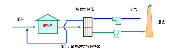 | 用熱管換熱器從工業(yè)爐的排氣中回收余熱以加熱空氣,余熱后的空氣返回工業(yè)爐作為助燃空氣使用。流程如圖1所示: