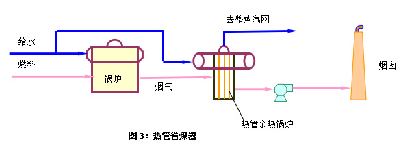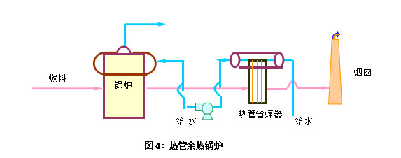 將熱管換熱器回收的余熱用來(lái)加熱水,使之成為鍋爐給水,或使水產(chǎn)生蒸汽供其他方面使用。其流程如圖3、圖4所示: