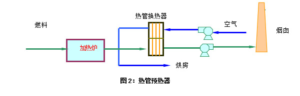 用熱管散熱器從排氣中回收余熱以加熱空氣,使之成為熱風(fēng)可作為供房的熱源。流程如圖2所示: