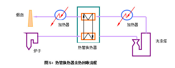 將熱管換熱器從排氣中回收來(lái)的余熱再次加熱排氣自身,使得經(jīng)洗滌過(guò)的氣體溫度升高,以免腐蝕排煙設(shè)備。流程如圖5所示: